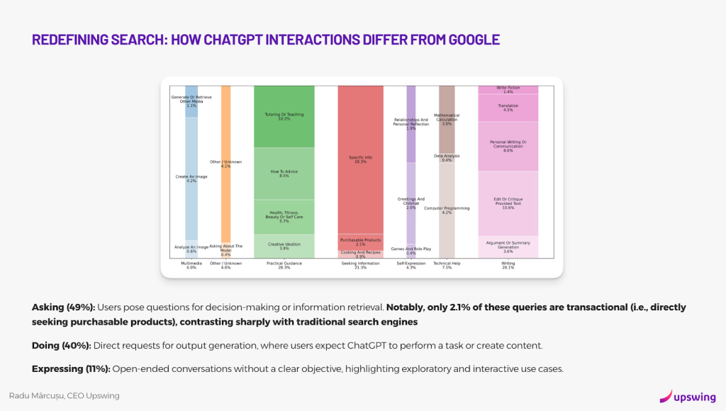 Cea mai mare categorie de interacțiuni pe ChatGPT este „asking”, iar 23% din aceasta înseamnă „seeking information”. Este singura zonă care explodează față de anul trecut. Asta înseamnă că tu și alți utilizatori folosiți ChatGPT tot mai mult ca pe un motor de căutare. Așadar, merită să fii prezent și în acest ecosistem.