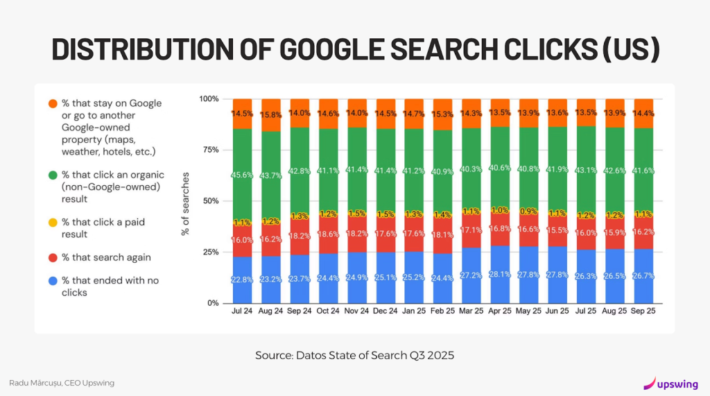 Traficul organic tradițional va continua să fie afectat de creșterea căutărilor cu zero click-uri, în special prin Google AI Overviews. De exemplu, în iulie 2024, în SUA, căutările încheiate fără click organic au crescut de la 22,8% la 26,7% , un trend care va ajunge în curând și în Europa.